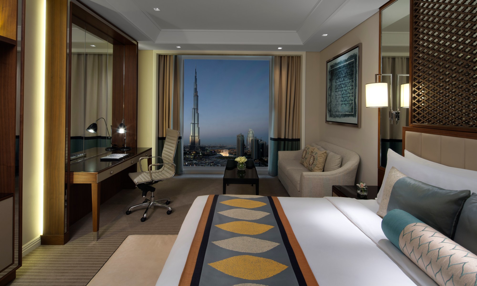 Something you might not know about Taj Dubai is that it is achingly cool. An eclectic fusion of traditional Indian artistry and contemporary design, the hotel manages to pay homage to its heritage whilst maintaining a sleek, minimalist design that sets it apart from many of the glitzy hotels in Dubai. What appears to be a relatively non-descript building by Dubai’s standards from the outside, blossoms into a vibrant melting pot of east meets west inside. From the focal low-hanging modern twist of a traditional chandelier taking center stage in the lobby to the sculptures and artwork that adorn communal areas, your eyes are constantly darting towards the next interesting feature.